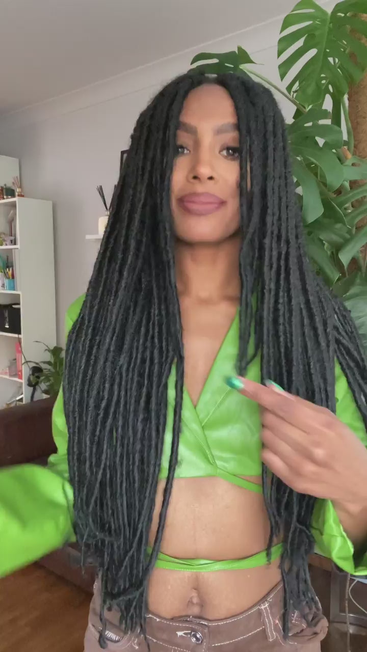 - Pre-looped synthetic fibre designed to mimic straight locs