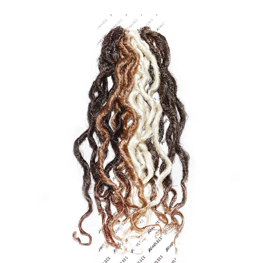 Highly textures bohemian locs with dark roots for added realism.